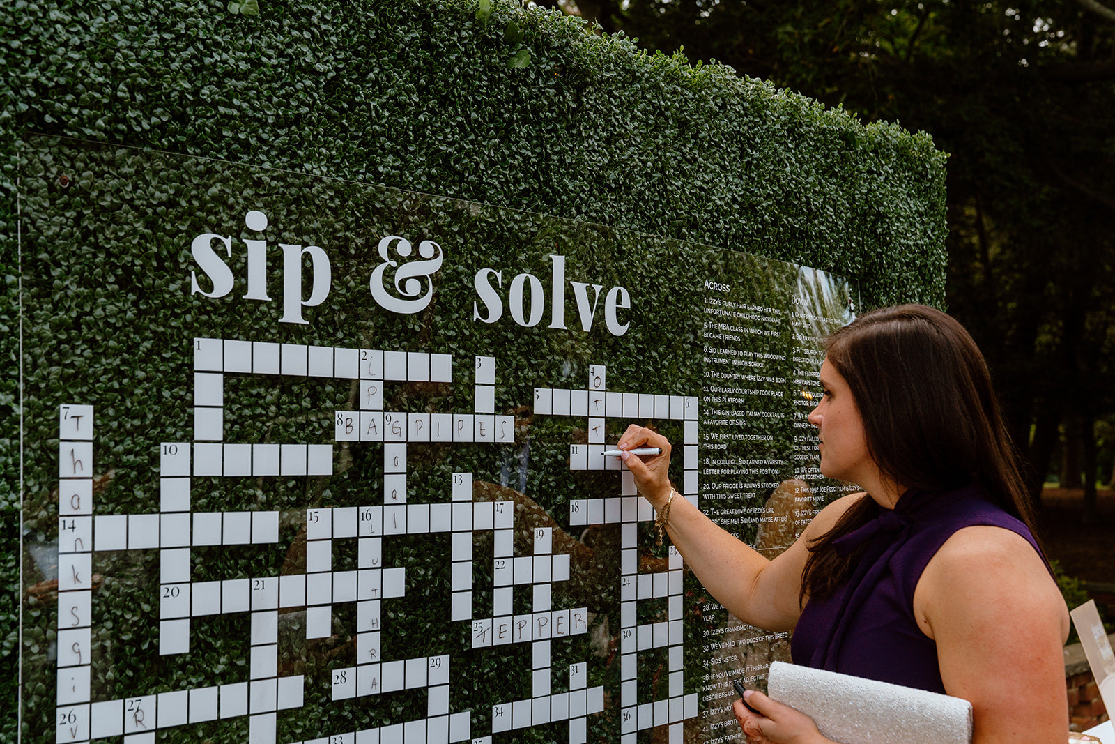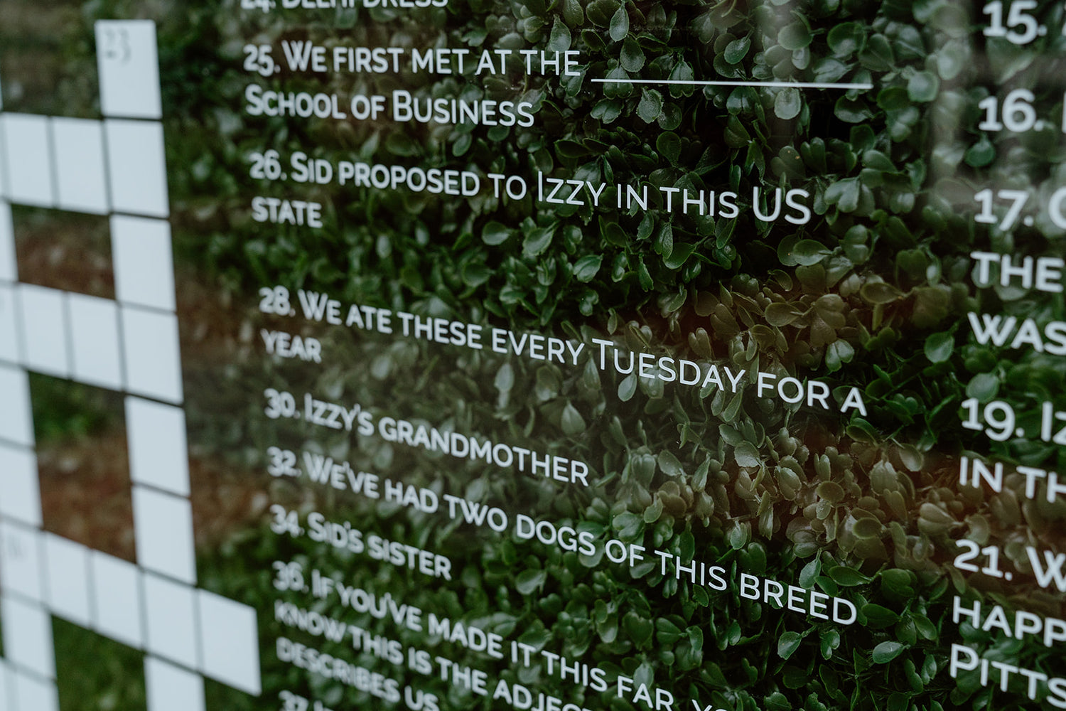 We’ll collaborate with you to craft a one-of-a-kind crossword puzzle that mirrors your unique style and tells your love story. Our detailed questionnaire will serve as the cornerstone, helping us weave clues that showcase your shared history and personalities. We’ll also draw inspiration from your design plans and Pinterest boards to create a puzzle that fits the look and feel of your wedding. Before we print, we’ll send you a proof to make sure you’re 100% obsessed with your design.
